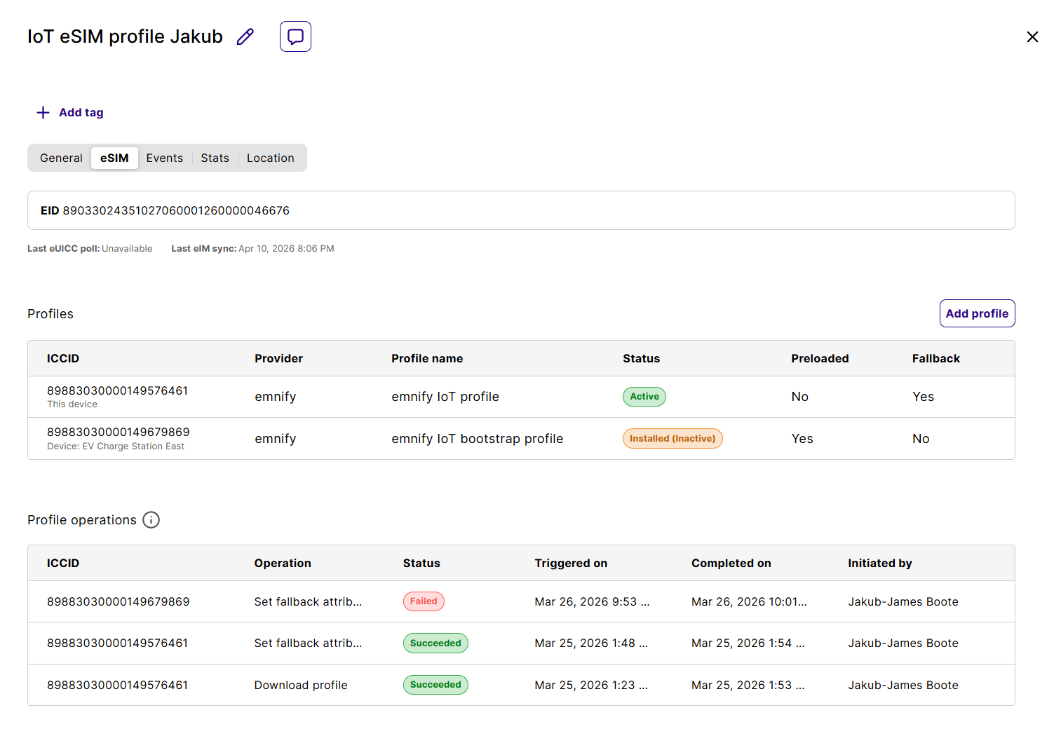 Profile management operations aren’t immediately applied. When you add a profile, you schedule an operation with the emnify platform and eIM. The eUICC executes the download the next time it connects to the eIM. You can track the download progress in the Profile operations log.