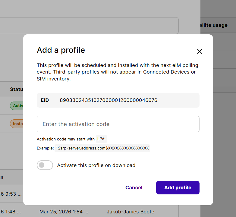 You need to get the activation code from the connectivity provider whose profile you want to download. You can choose to directly activate the profile (which deactivates the currently active profile) or download the profile without activating it (for example, to later set it as a fallback profile).