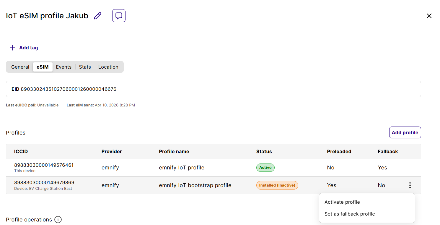 Find the profile you want to activate and open its actions menu by clicking the three-dot icon (⋮) in its row. Select Activate profile. An operation is scheduled to activate the specific profile. The next time the eUICC polls the emnify platform, the operation is executed.