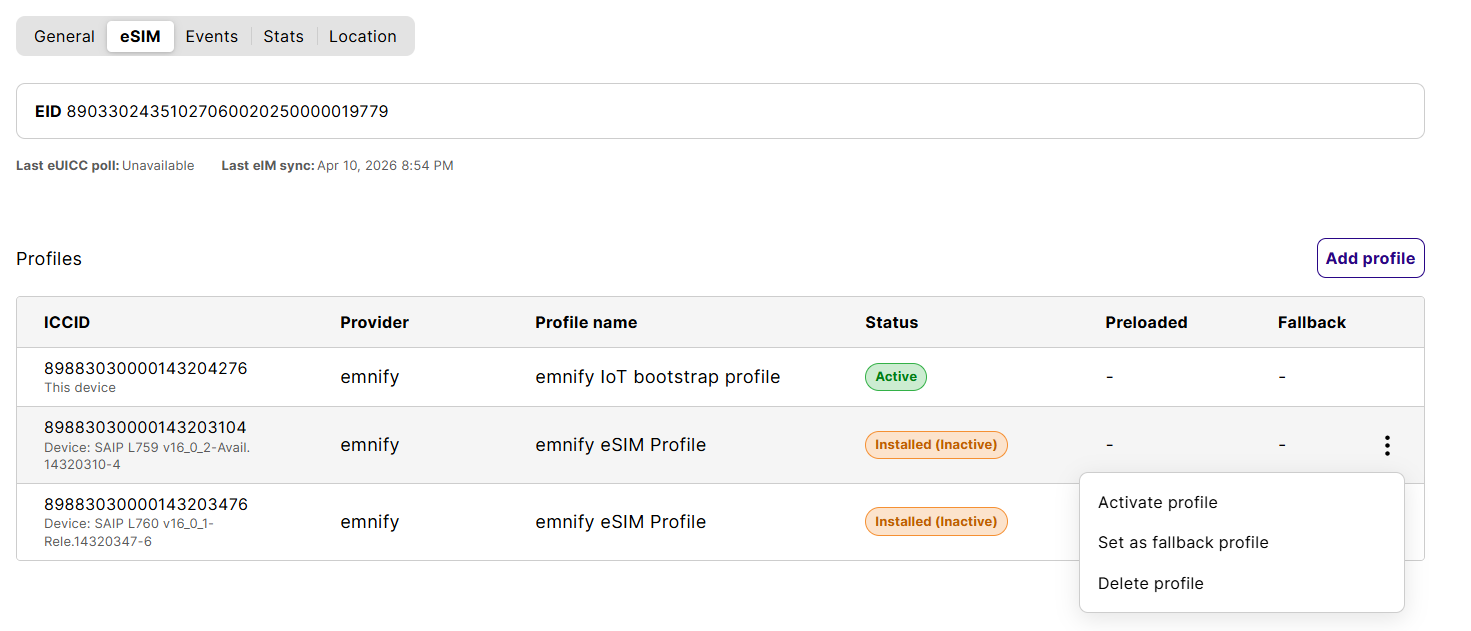 - The last eUICC poll time, which indicates when the eUICC checked with the emnify eIM for pending operations. By default, the eUICC polls the eIM with every device restart and every 24 hours.