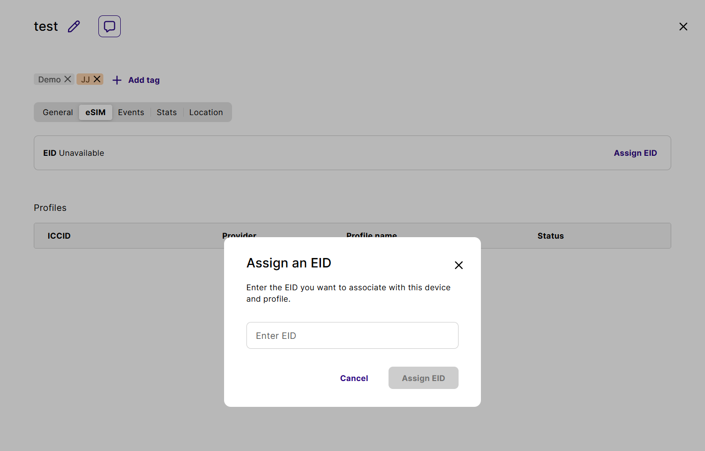 In the eSIM tab, click Assign eID to assign the eID of the device to the eSIM profile.