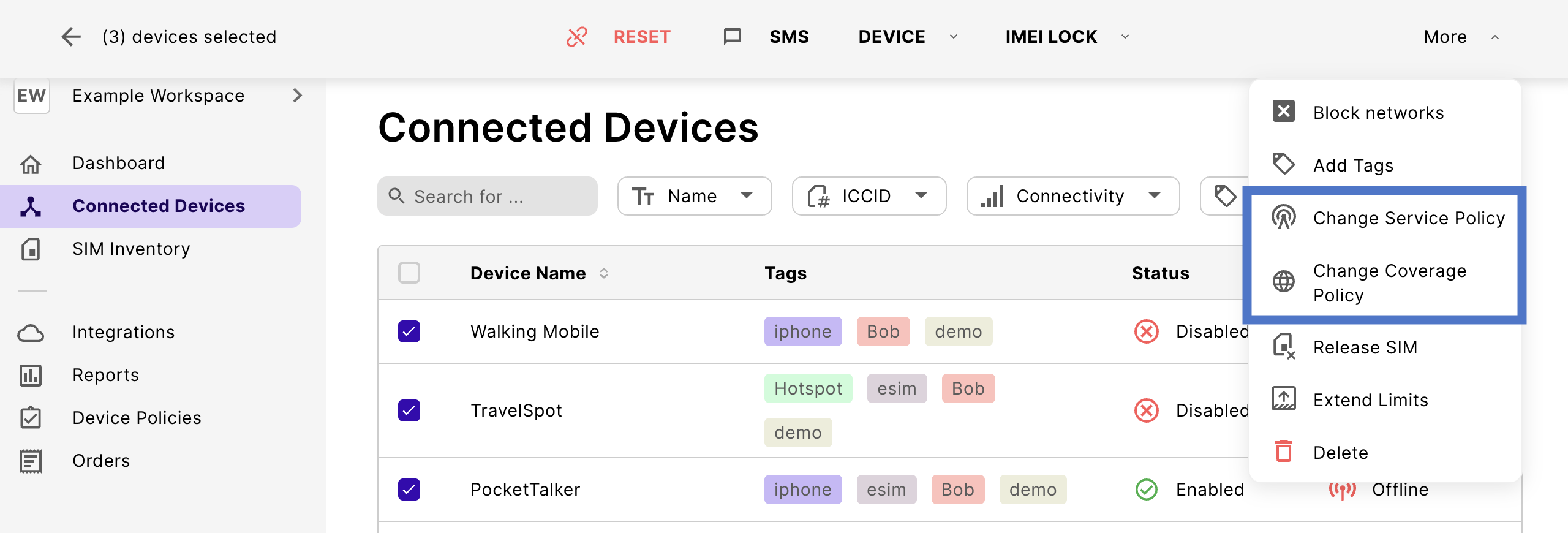 Device policies only become useful after you start assigning devices to them. You can assign single or multiple devices to a policy in the emnify Portal.