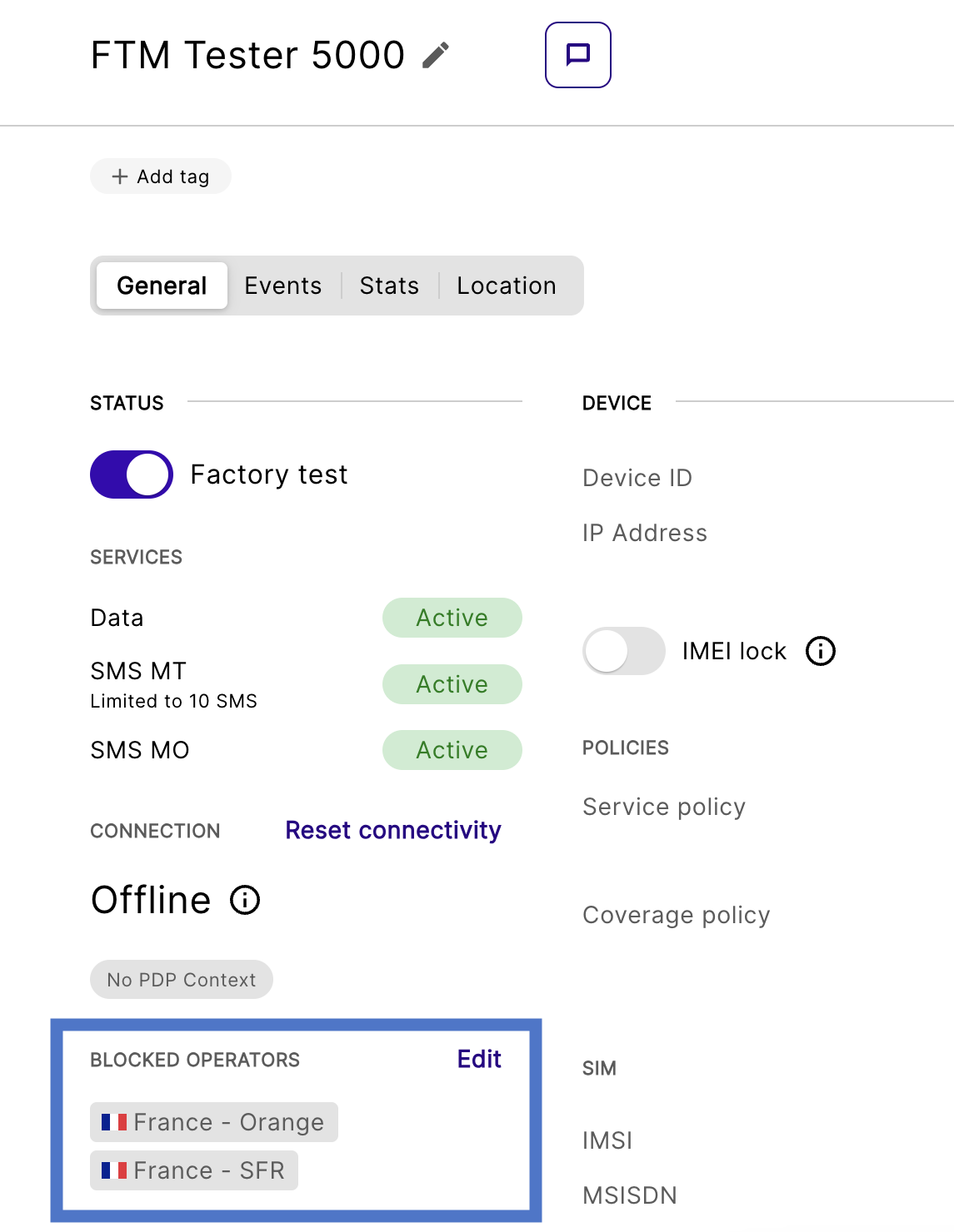 Adding a network to the Blocked Operators list doesn’t prevent your devices from trying to connect to those networks. You still see the attempts in the Events tab, but emnify’s mobile core rejects any connection attempt. You should only use this feature to solve technical issues associated with specific operators.