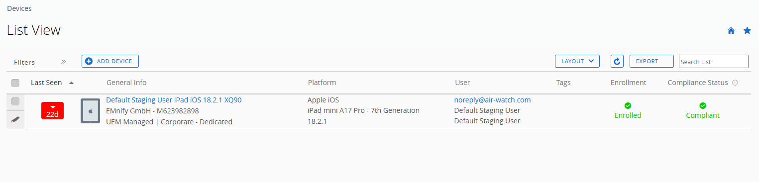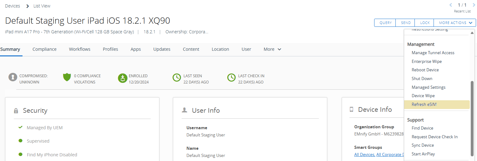 This guide explains how to deploy and activate the emnify Consumer eSIM Global using Omnissa Workspace ONE Unified Endpoint Management (UEM). It includes instructions for checking device compatibility, enrolling Apple devices, ordering eSIM profiles, activating them remotely through Workspace ONE UEM, and configuring the APN settings.