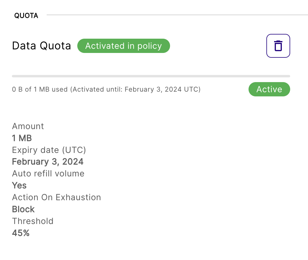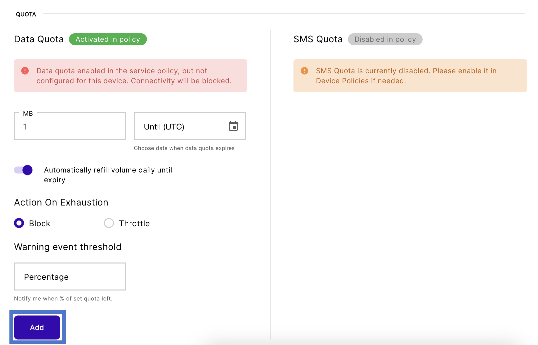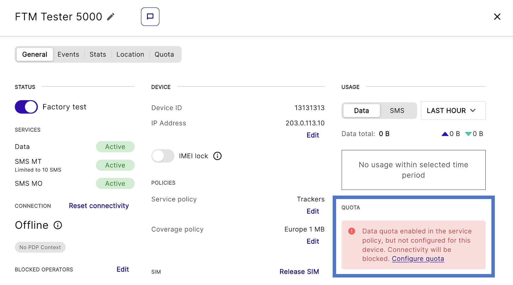 After you turn on quota management in the service policy, you must assign a quota to each device that uses this service policy. Otherwise, these devices are blocked from creating PDP activation sessions because there’s no defined quota.