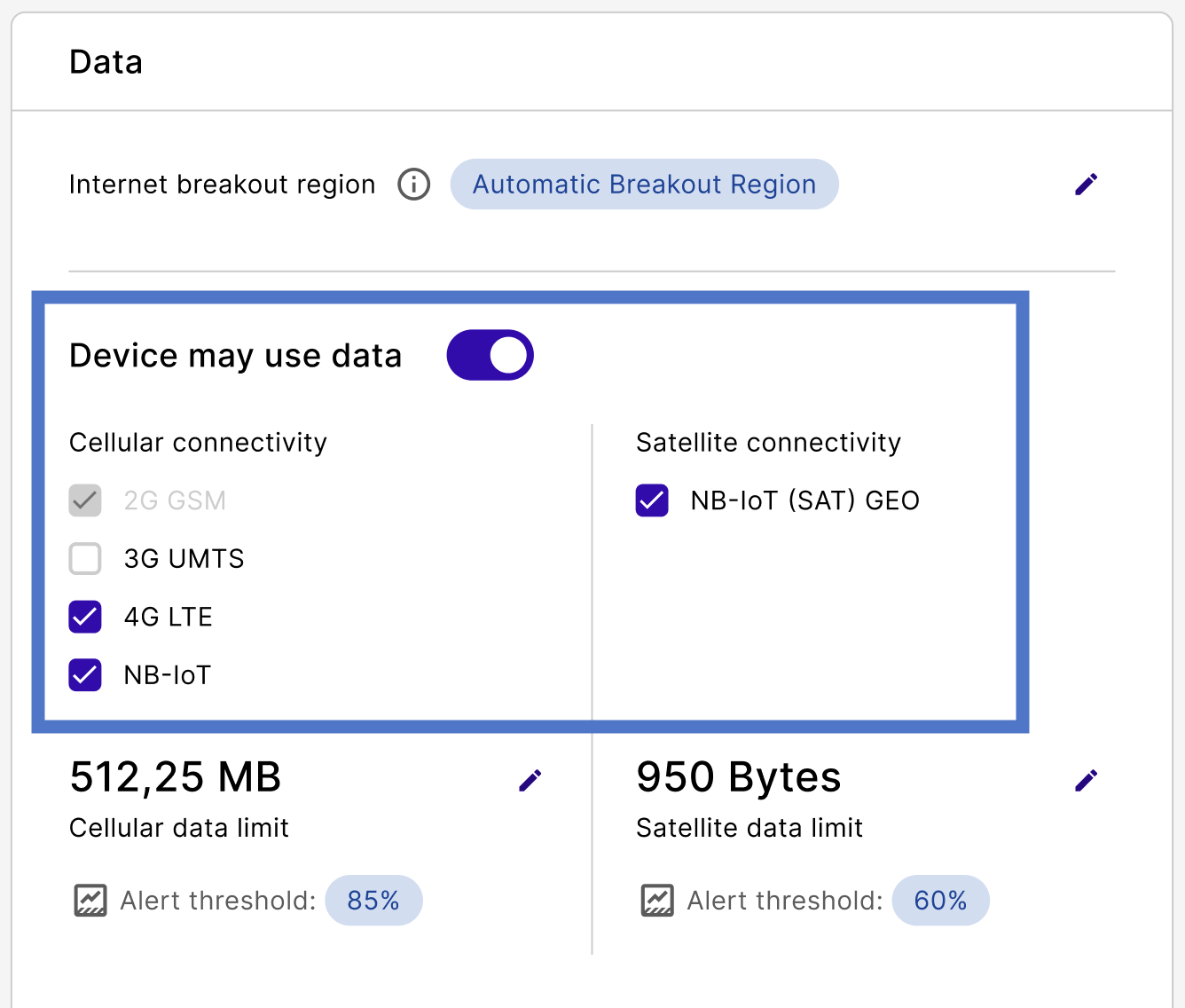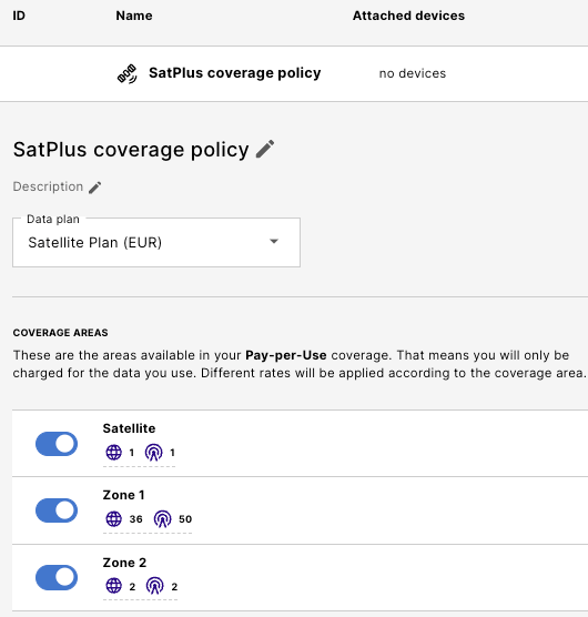 Currently, satellite connectivity is always permitted when devices can use data. emnify is working on a feature that allows you to permit or block satellite data usage for your devices within the service policy.