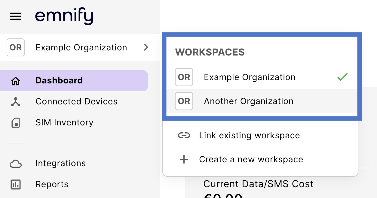 This guide shows you how to switch between your linked Workspaces via the Workspace switcher in the emnify Portal.