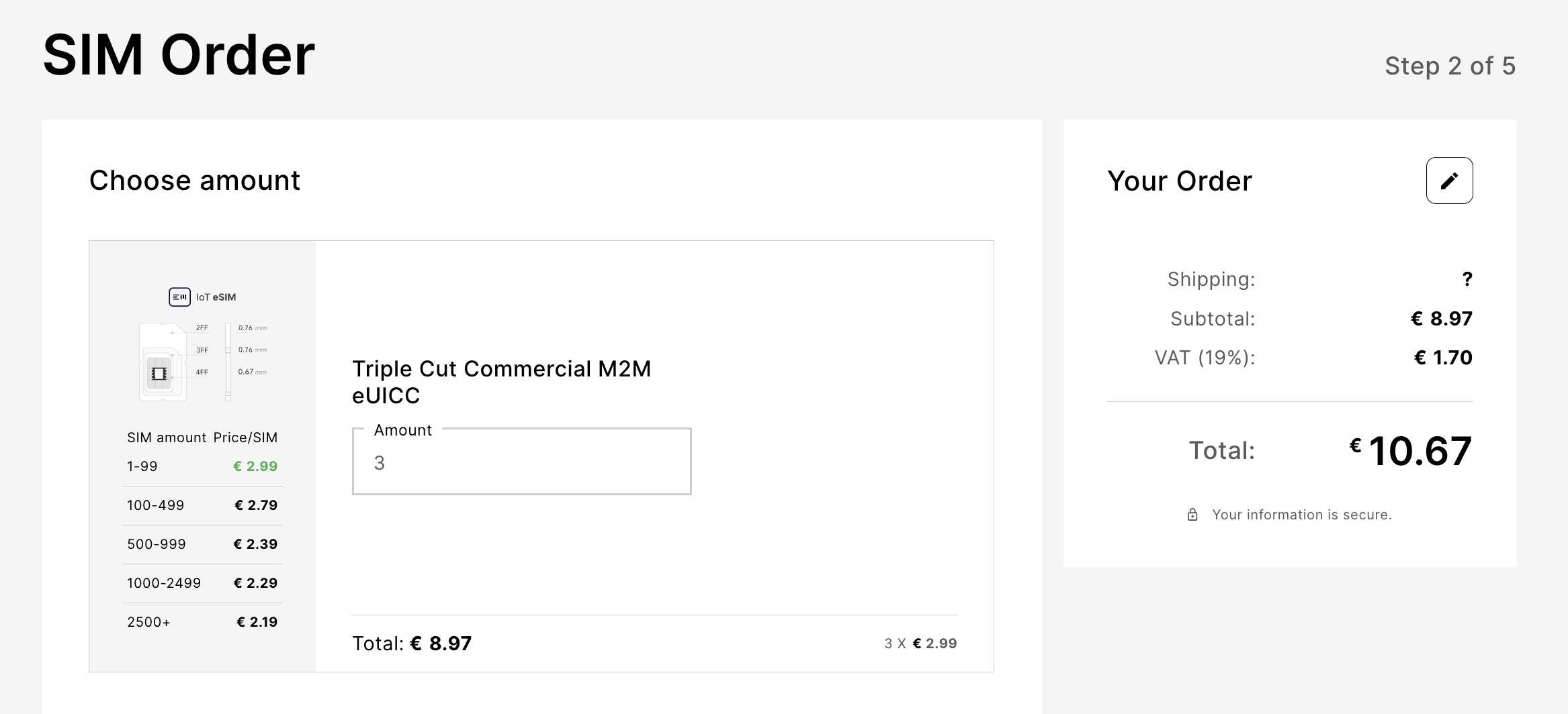 You’ll land on the SIM Order page that shows an overview of your order so far. Here, you can specify the amount of each SIM type you want to receive.