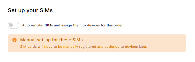 If you prefer to register the SIM batches in your account at a later time, switch the Auto register SIMs toggle off and use the batch identification code (BIC) to manually register the SIMs.